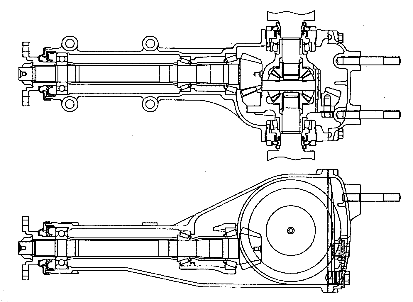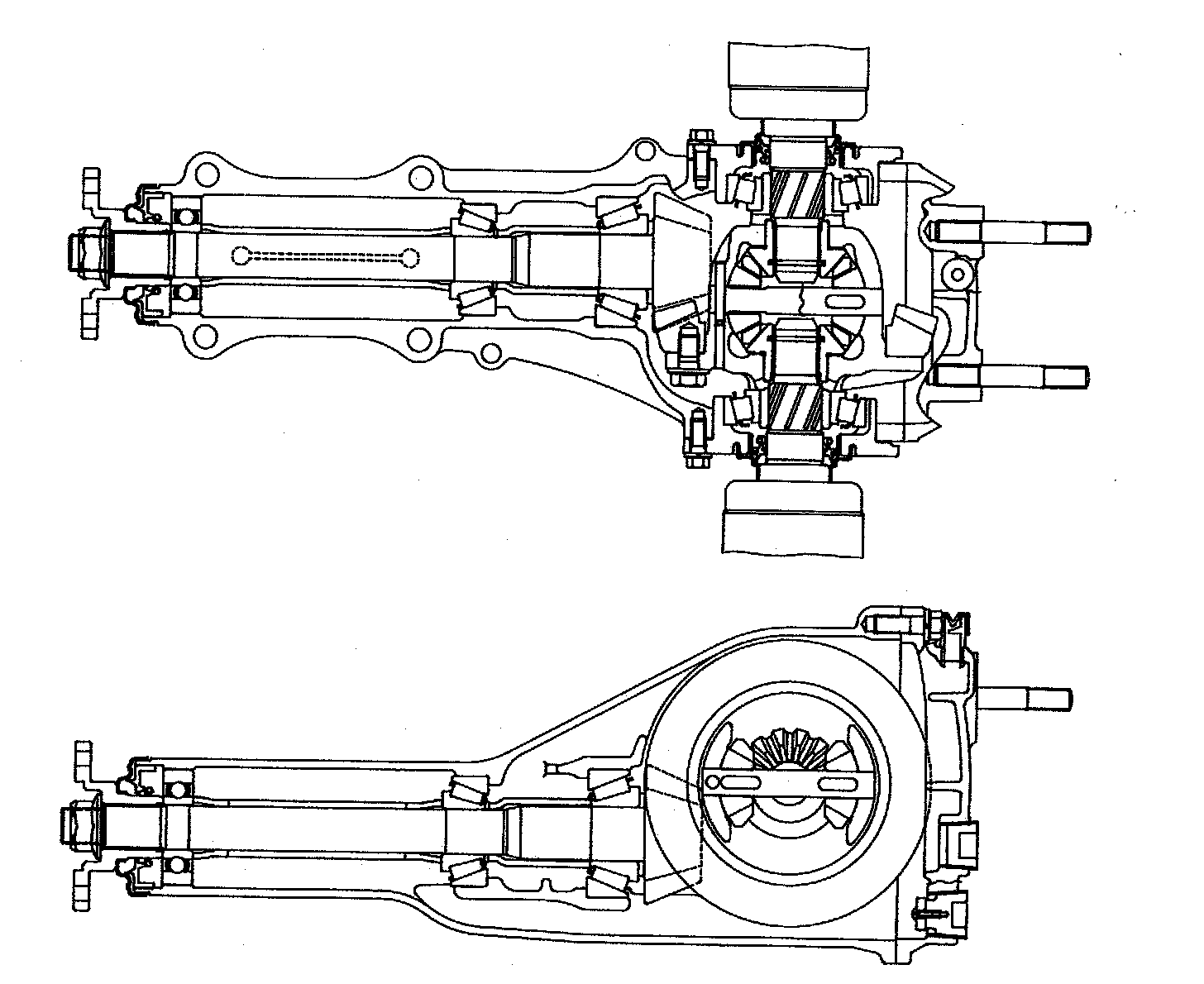 A hypoid drive gear with a nominal diameter of 152 mm (5.98 inch) is used and the drive pinion shaft is supported on three bearings, the bearing preload being adjusted by a selective spacer and washer. The drive pinion height is adjusted by selecting washers located at the drive pinion neck using Dummy Shaft and Gauge.