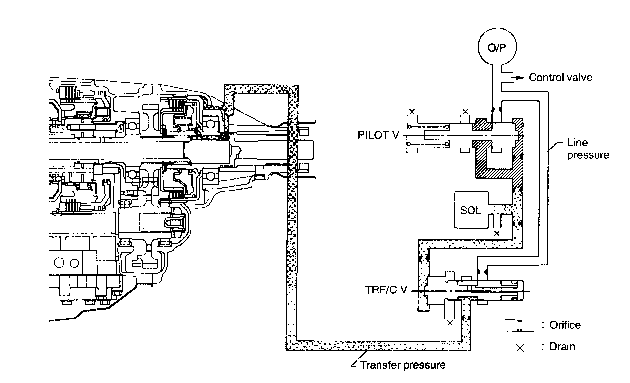 This line pressure is reduced to a fixed level by the pilot valve, and becomes the initial pressure of the duty solenoid C. Line pressure is also delivered to the transfer control valve where it is regulated by duty pressure variations to control the oil pressure so that optimum rear torque distribution is obtained according to running conditions.