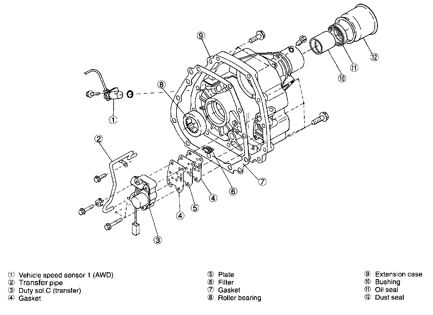 The transfer unit consists of a hydraulic multi-plate clutch and a transfer hydraulic control system incorporating a duty solenoid valve. It is housed in the extension case together with the bearings, rear drive shaft, etc.