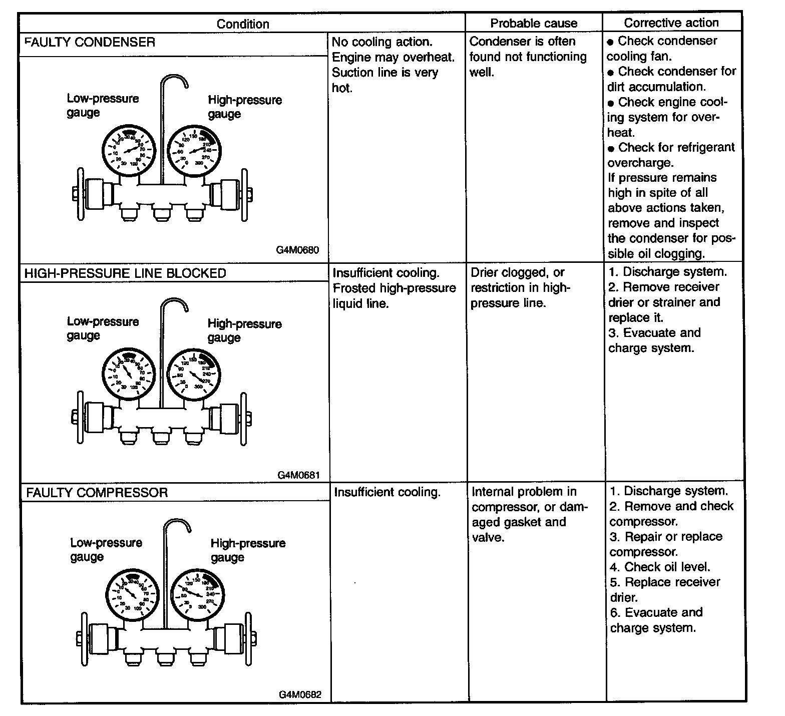 If various conditions caused to other air conditioning system, the characteristics revealed on manifold gauge reading are shown in the following. As to the method of a performance test, refer to the item of "Performance Test".