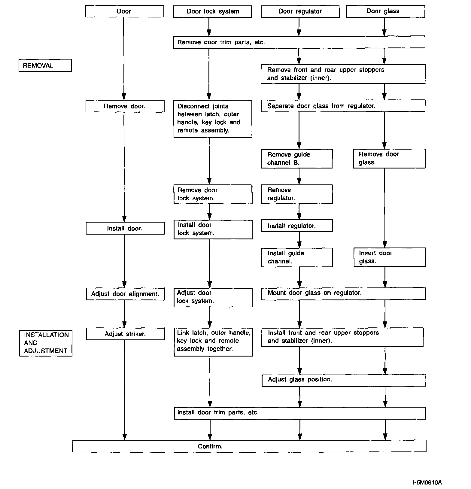 This flowchart shows the main procedures for removing and installing the door and its related parts. For details, refer to the text.
