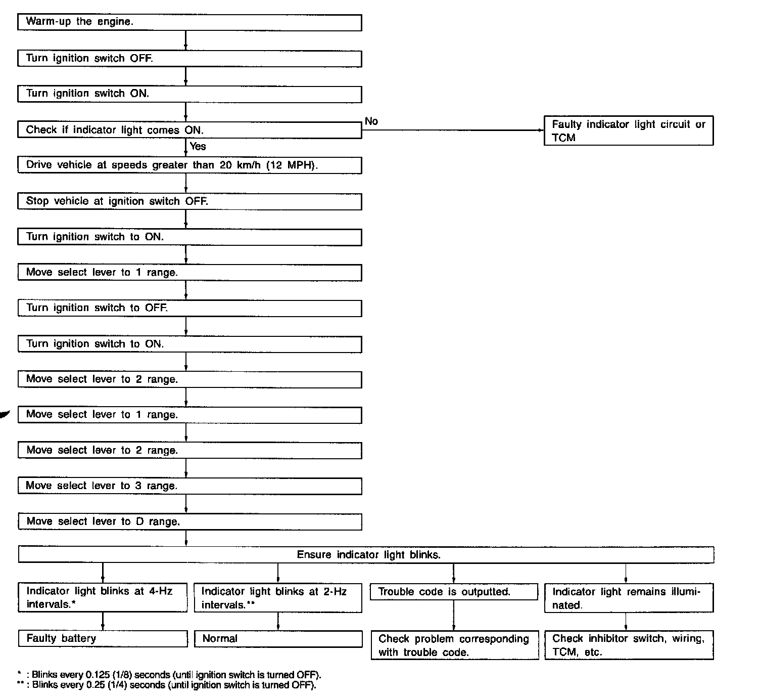 The AT OIL TEMP indicator light flashes the code corresponding to the faulty part. The long segment (1.2 sec on) indicates a "ten", and the short segment (0.2 sec on) signifies a "one".