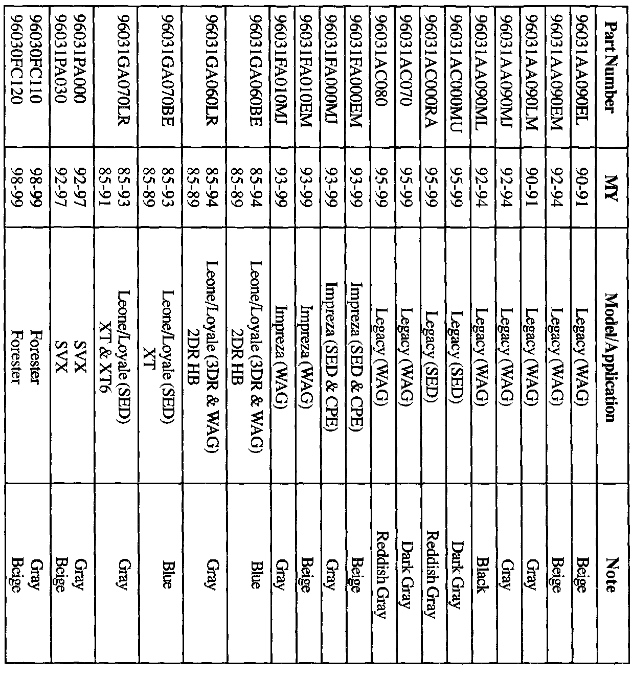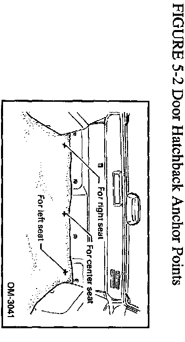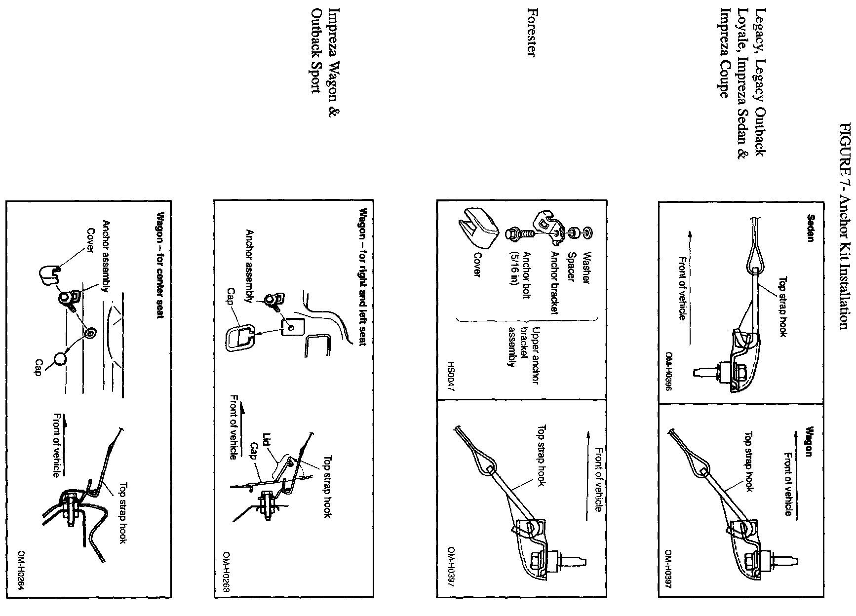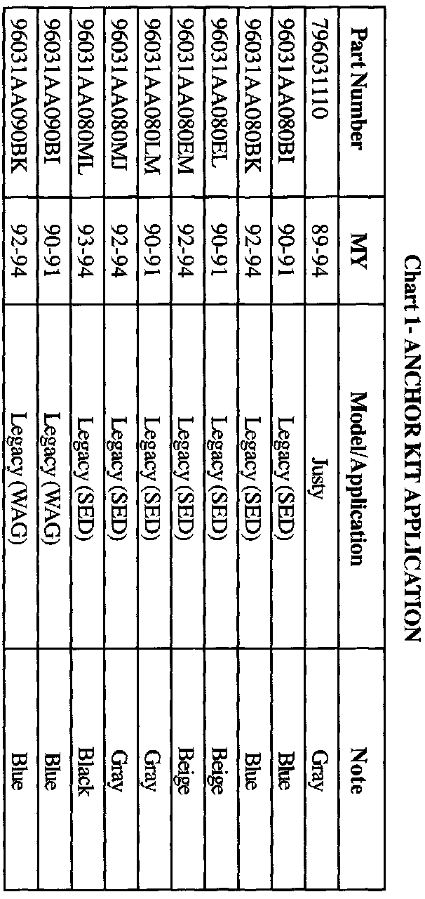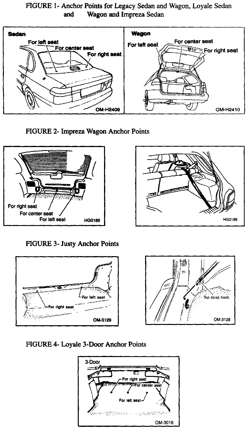 This new requirement for 2000 model year vehicles may cause customer demand for installation of top tether anchor kits on earlier model vehicles. You should be prepared to install these factory supplied top tether anchor kits on customer request in 1985 and later Subaru vehicles. Anchor kits are not available for 1987 and 1988 lusty models (which began in 1989 MY) in accordance with Chart 1 as shown. Installation instructions are included with the anchor kit. Anchor points are shown in Figures 1 through 5 for all models. On 1995 through 1999 Legacy Sedan vehicles, the package shelf material is not cut out at the anchor pint location. You must locate the threaded anchor point from the trunk side of the package shelf and cut out the package shelf material to accommodate the anchor kit bolt.