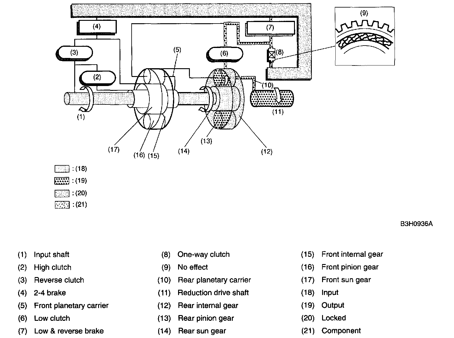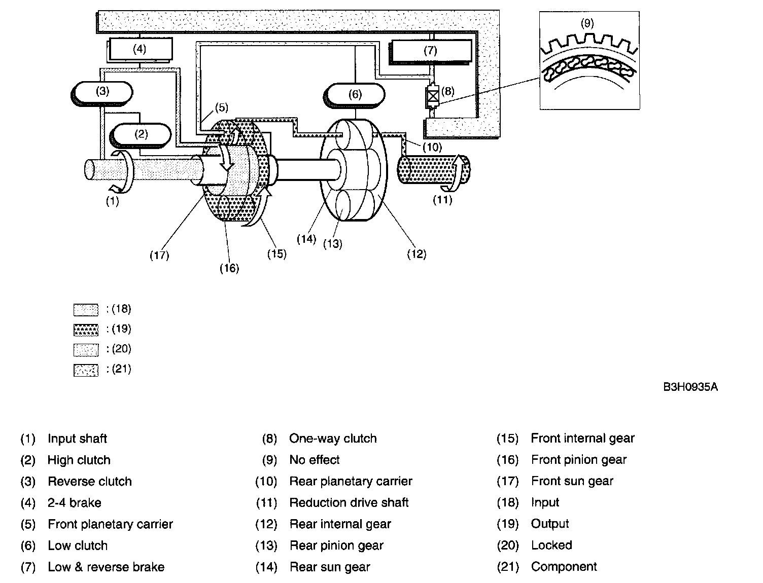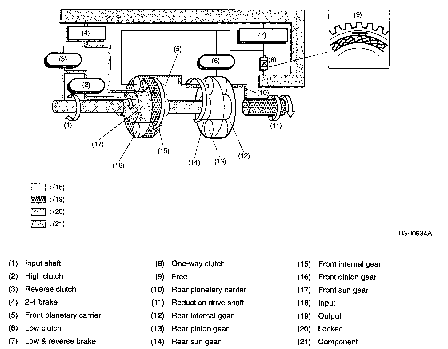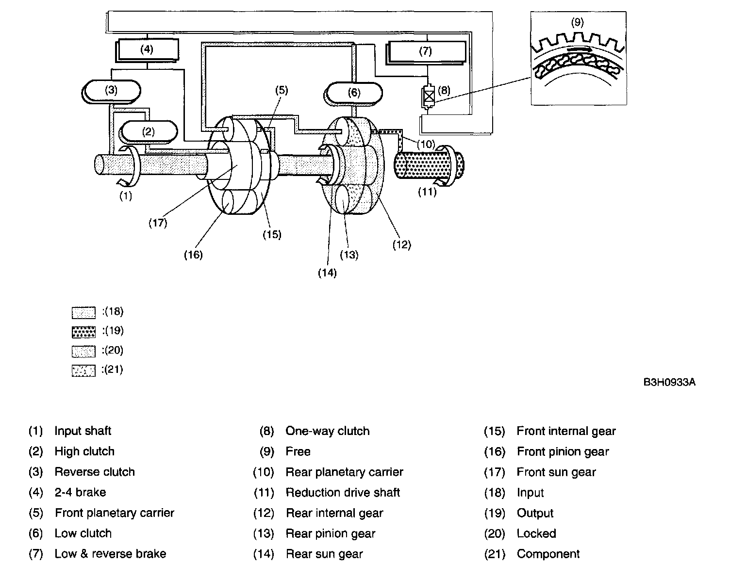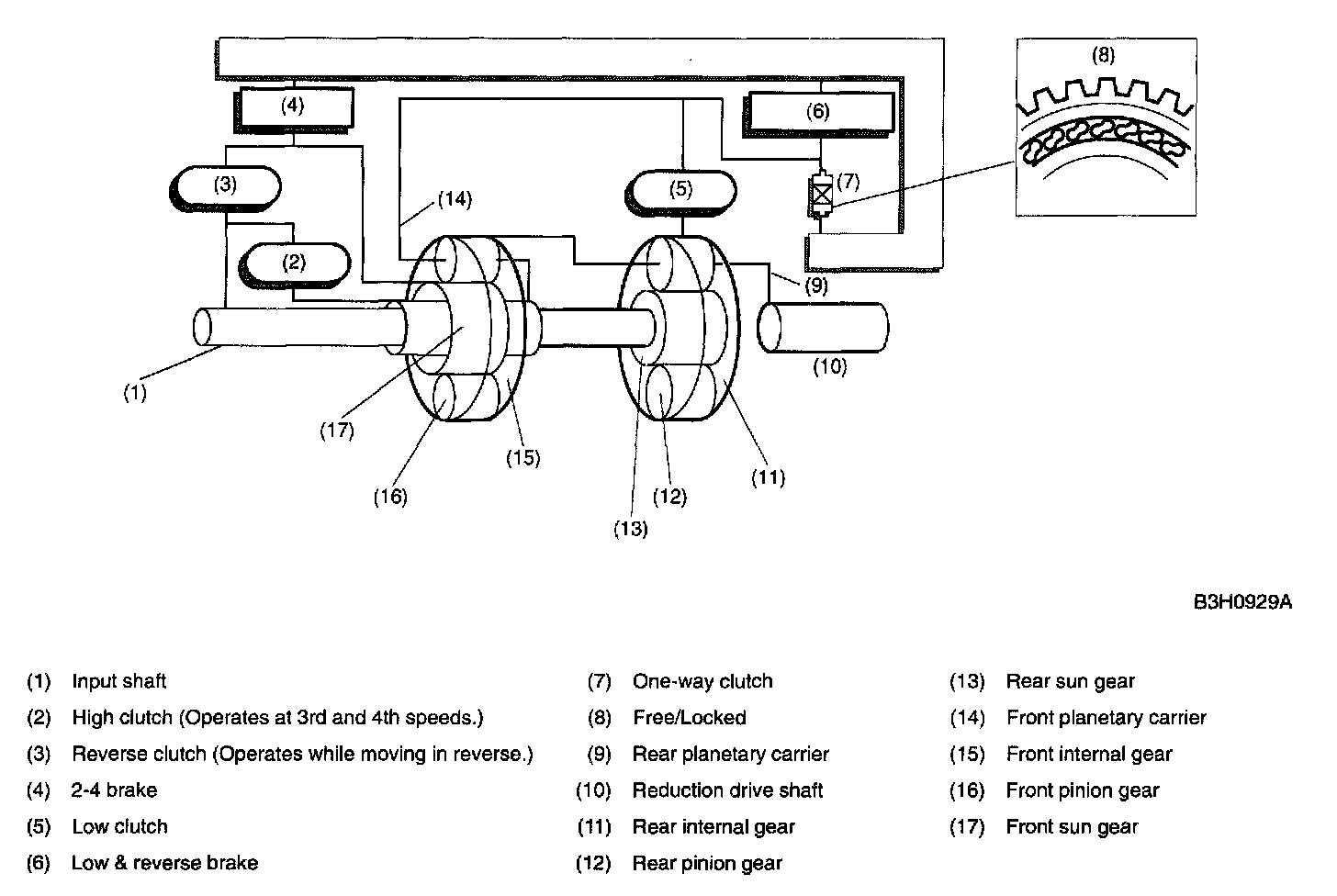 A: CONSTRUCTIONThe gear train consists of two sets of planetary gears, three sets of multi-plate clutches, two sets of multi-plate brakes and one set of one-way clutch.