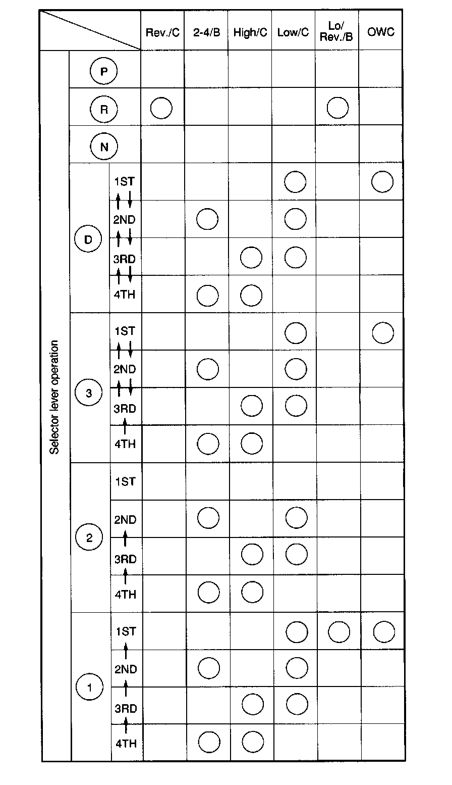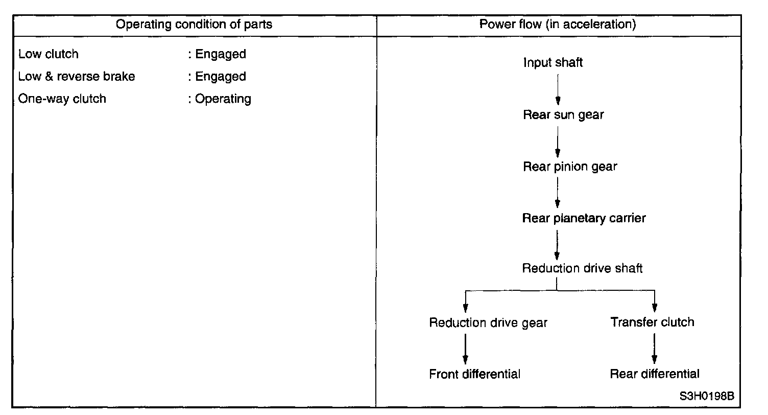 At 1st speed of this range, the low clutch and the low & reverse brake are thrown into engagement. The 1st speed in this range shows the same operation as the 1st speed in the D or 3 range. However, the one-way clutch produces no effect because the low & reverse brake is operated.