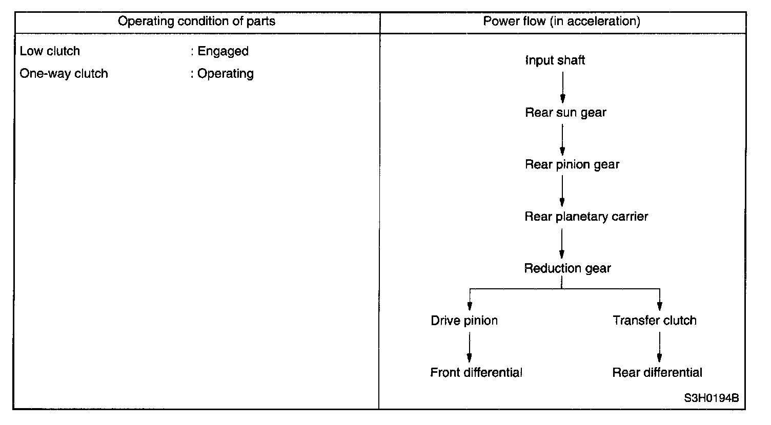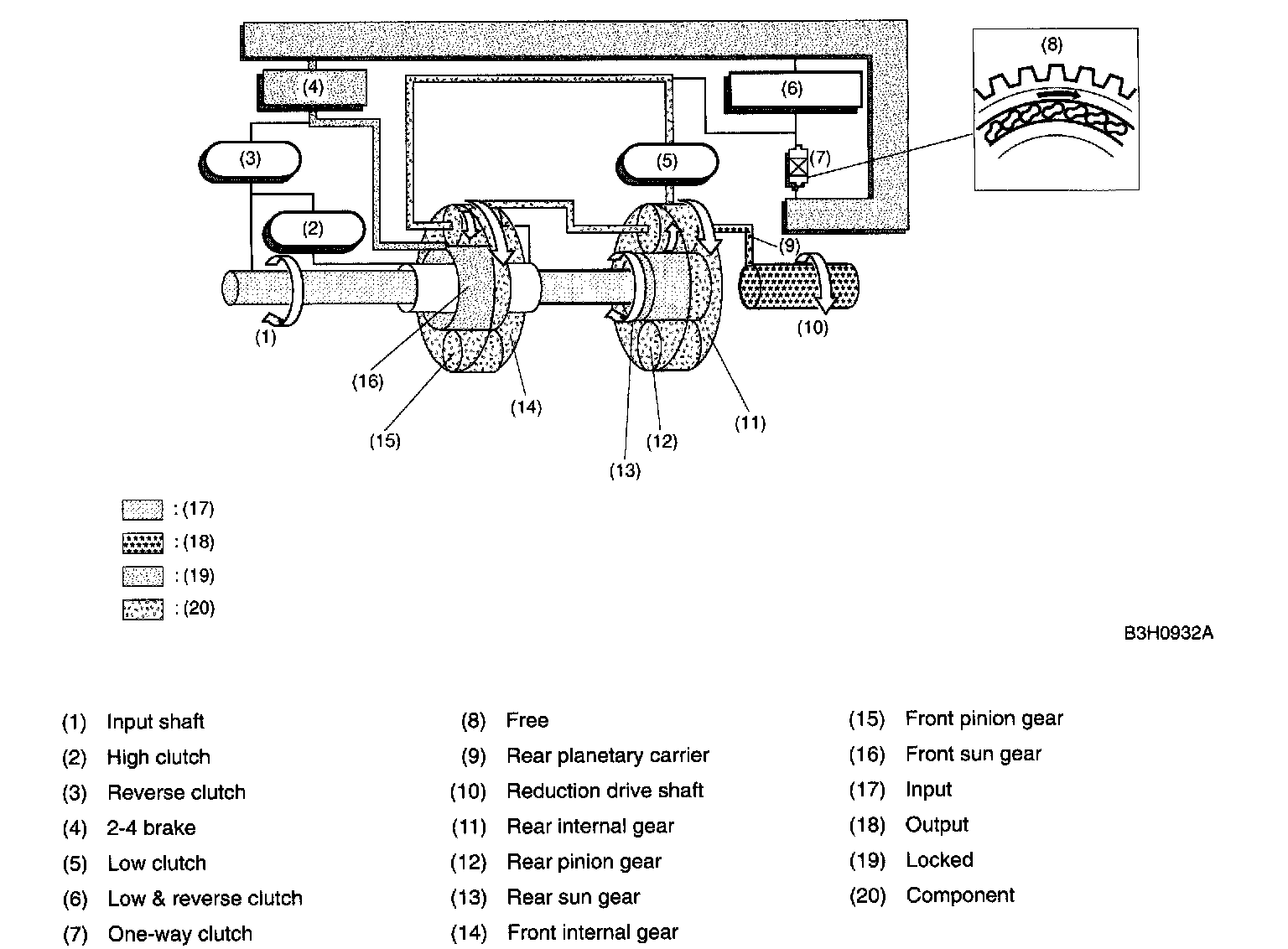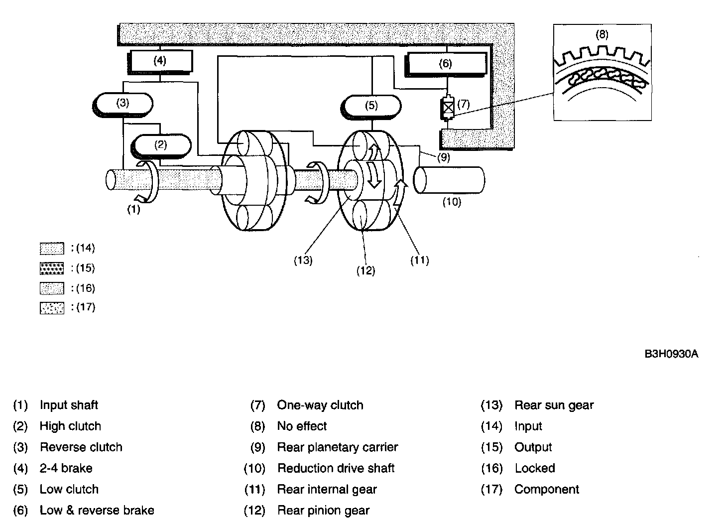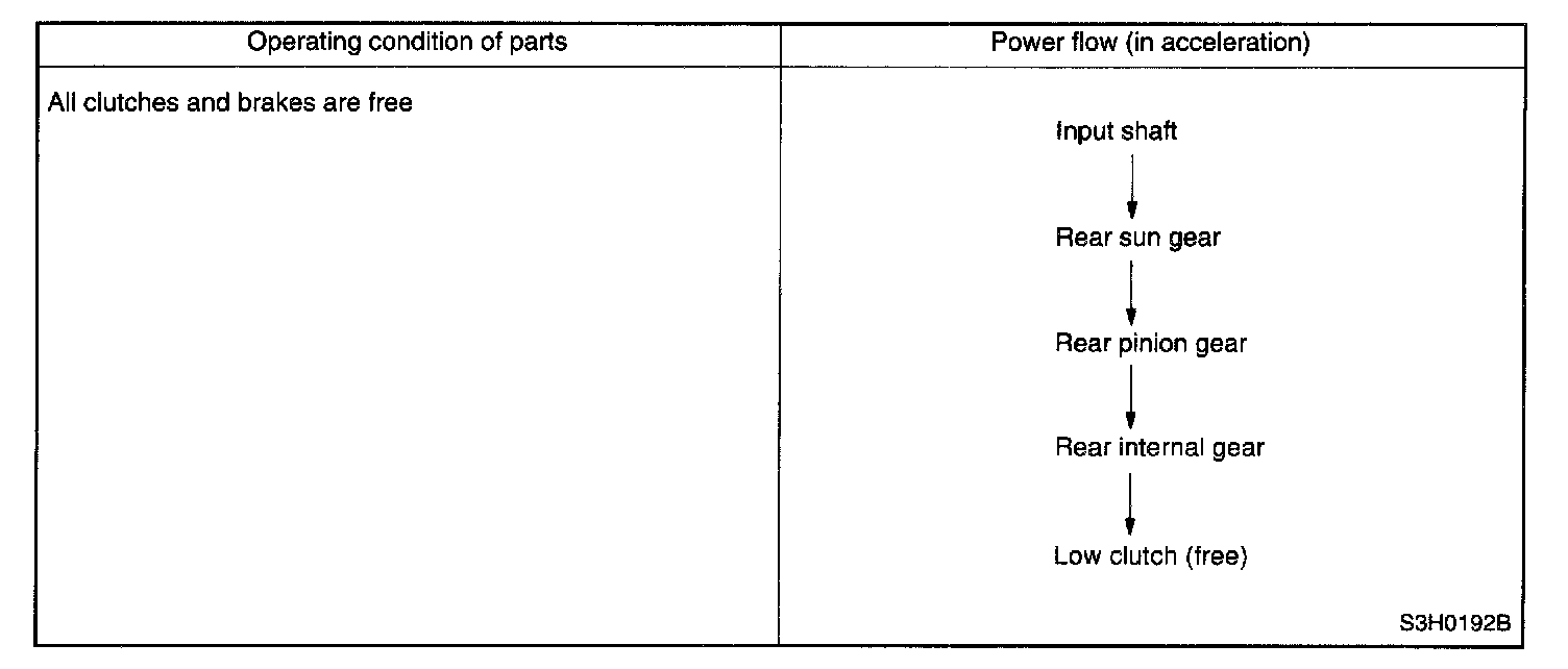 The one-way clutch is free because the low clutch rotates clockwise. Since the driving power is transmitted without being affected by the one-way clutch, the back driving force from the reduction drive shaft is transmitted to the input shaft, thus the engine braking effect being available.