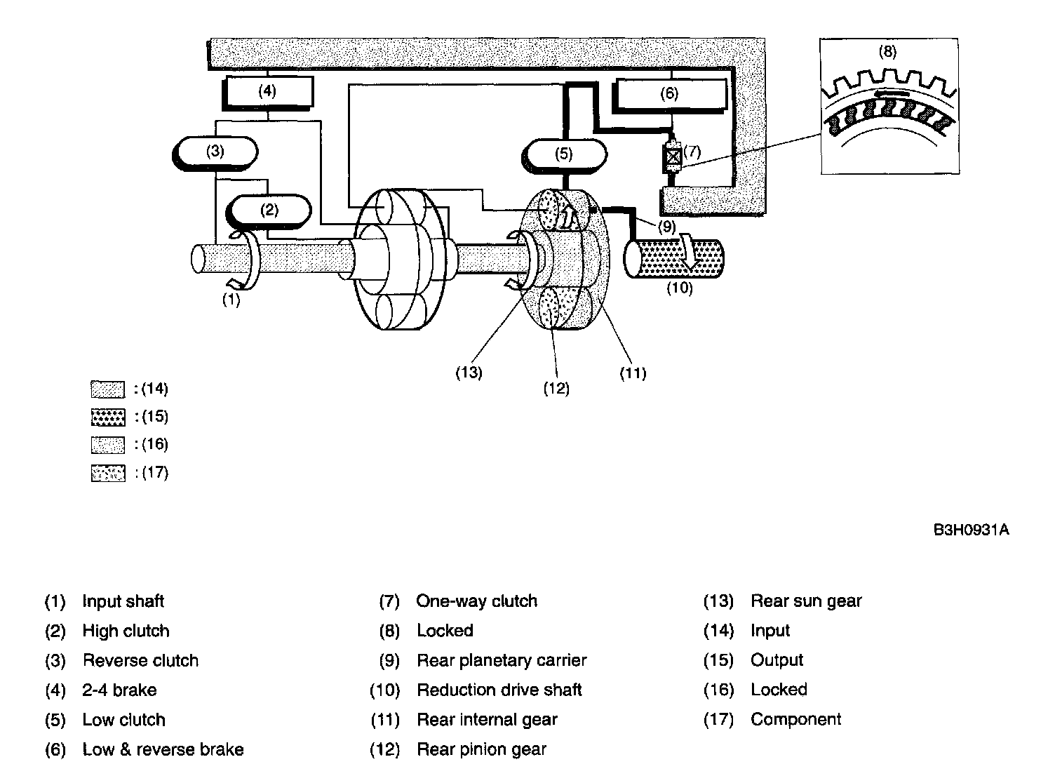 Since the rear sun gear and the high clutch drum are in mesh with the input shaft, they rotate together with input shaft.