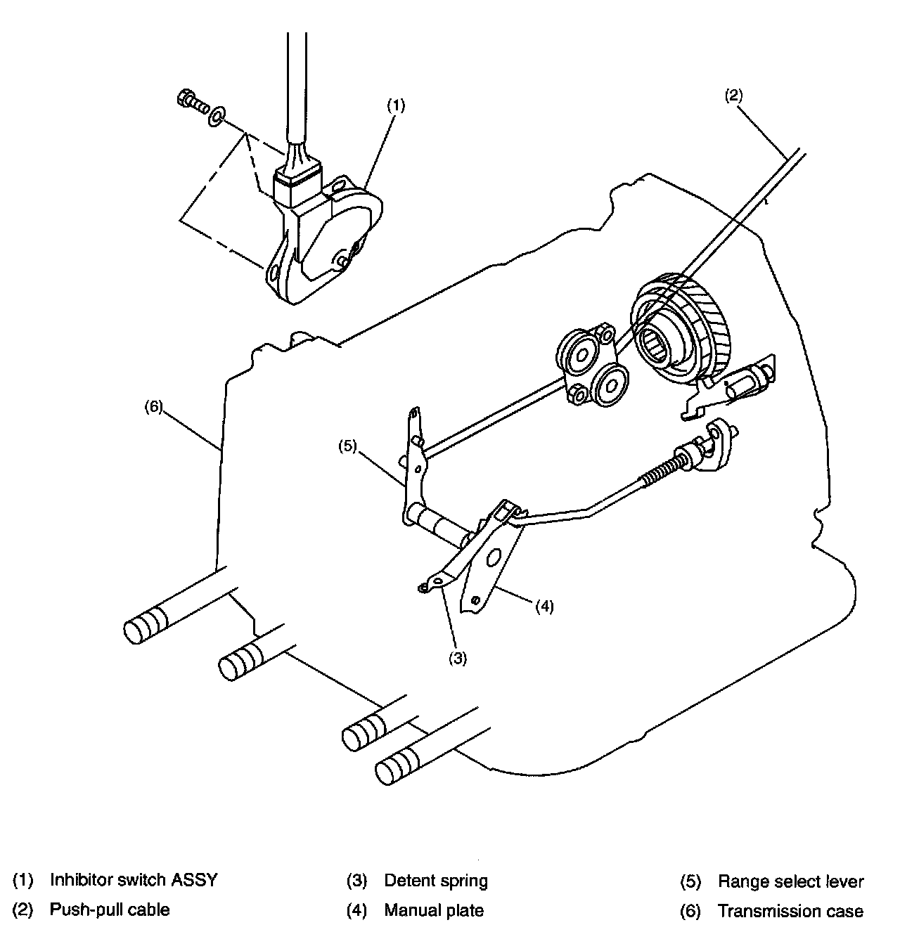 When the select lever is moved either forward or backward, the push-pull cable moves in the corresponding direction. This turns the manual shaft by way of the range select lever. At this point, the pin at the end of the range select lever turns the inhibitor switch arm to transmit a range signal to the control module.