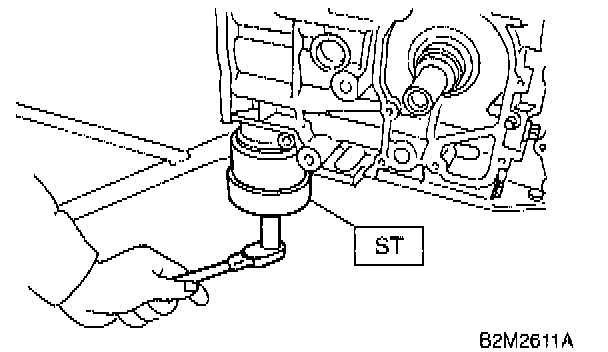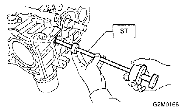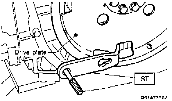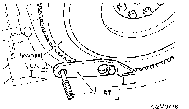 2. Remove flywheel (MT vehicles only) or drive plate (AT vehicles only). Using ST, lock crankshaft.