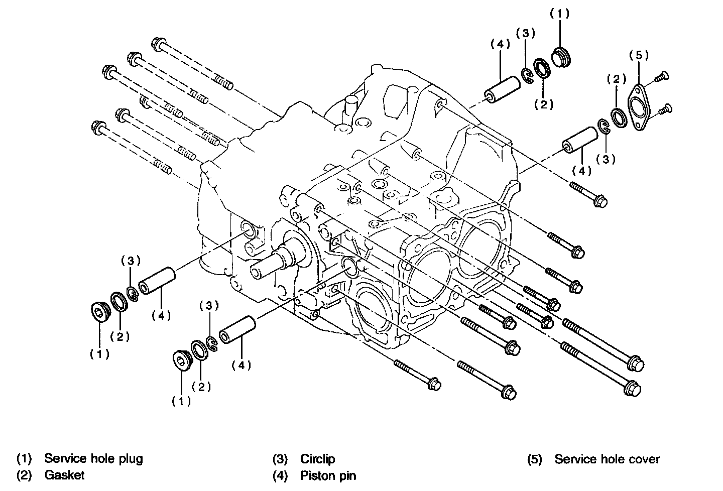 2. Rotate crankshaft to bring #1 and #2 pistons to bottom dead center position, then remove piston circlip through service hole of #1 and #2 cylinders.