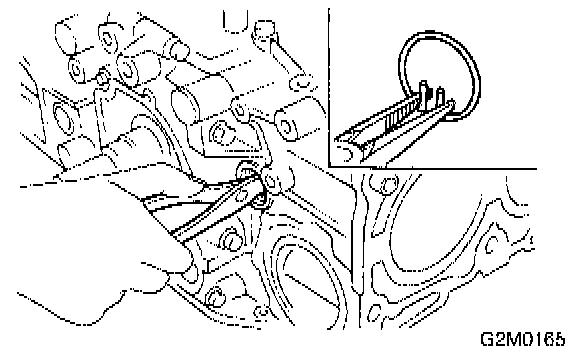 6. Remove oil pump from cylinder block. Use a flat-bladed screwdriver as shown in figure when removing oil pump.