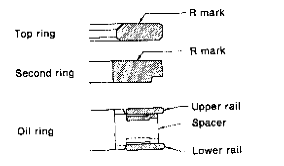 - "R" is marked on the end of the top and second rings. When installing the rings to the piston, face this mark upward.