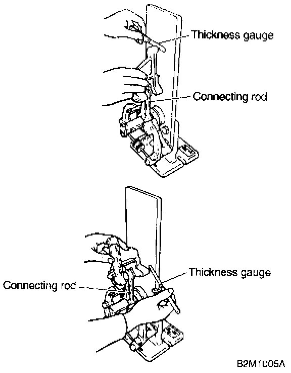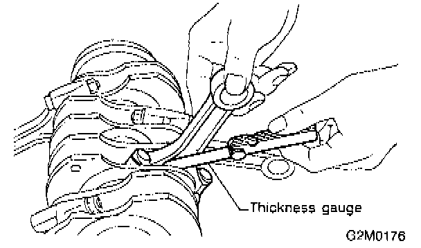 3. Install connecting rod fitted with bearing to crankshaft and measure the side clearance (thrust clearance). Replace connecting rod if the side clearance exceeds the specified limit.
