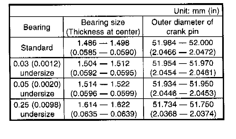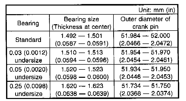 3. Inspect the crank journal and crank pin for wear. If not to specifications, replace bearing with an undersize one, and replace or recondition crankshaft as necessary. When grinding crank journal or crank pin, finish them to the specified dimensions according to the undersize bearing to be used.