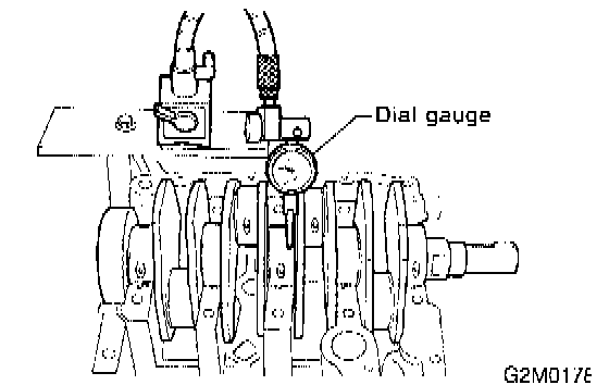 4. Measure the thrust clearance of crankshaft at center bearing. If the clearance exceeds the limit, replace bearing.