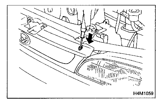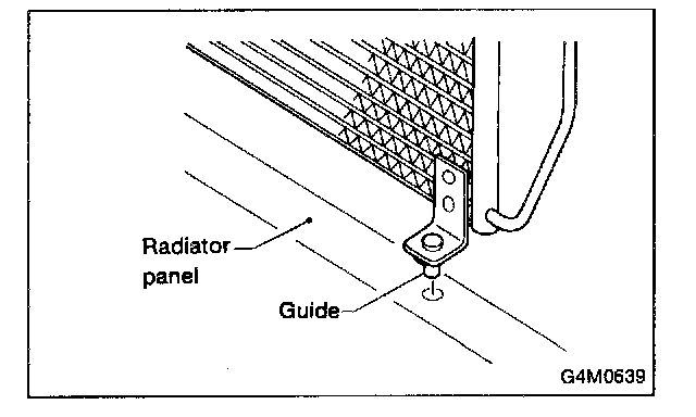 NOTE: After installing condenser, ensure that guide on lower side of condenser is inserted into hole in radiator panel. Tighten attaching bolts.