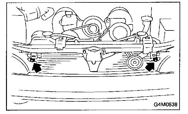 6. Remove the two bolts which secure condenser. While lifting condenser, remove it through space between radiator and radiator panel.