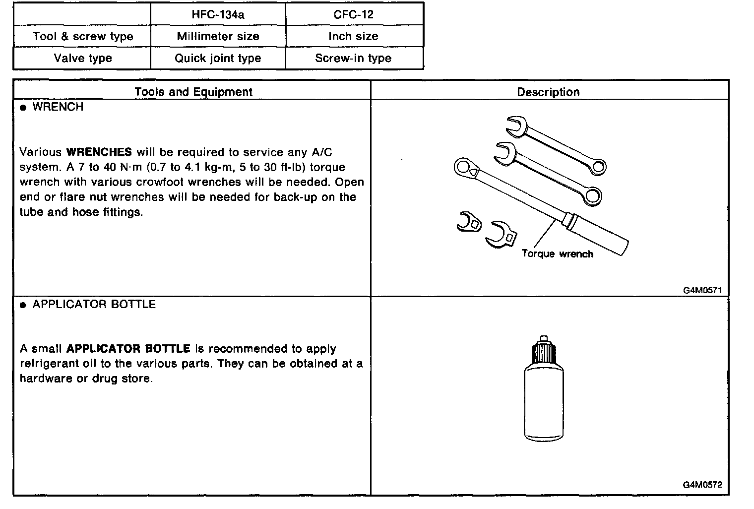 CAUTION: When working on vehicles with the HFC-134a system, only use HFC-134a specified tools and parts. Do not mix with CFC-12 tools and parts. If HFC-134a and CFC-12 refrigerant or compressor oil is mixed, poor lubrication will result and the compressor itself may be destroyed. In order to help prevent mixing HFC-134a and CFC-12 parts and liquid, the tool and screw type and the type of service valves used are different. The gas leak detectors for the HFC-134a and CFC-12 systems must also not be interchanged.