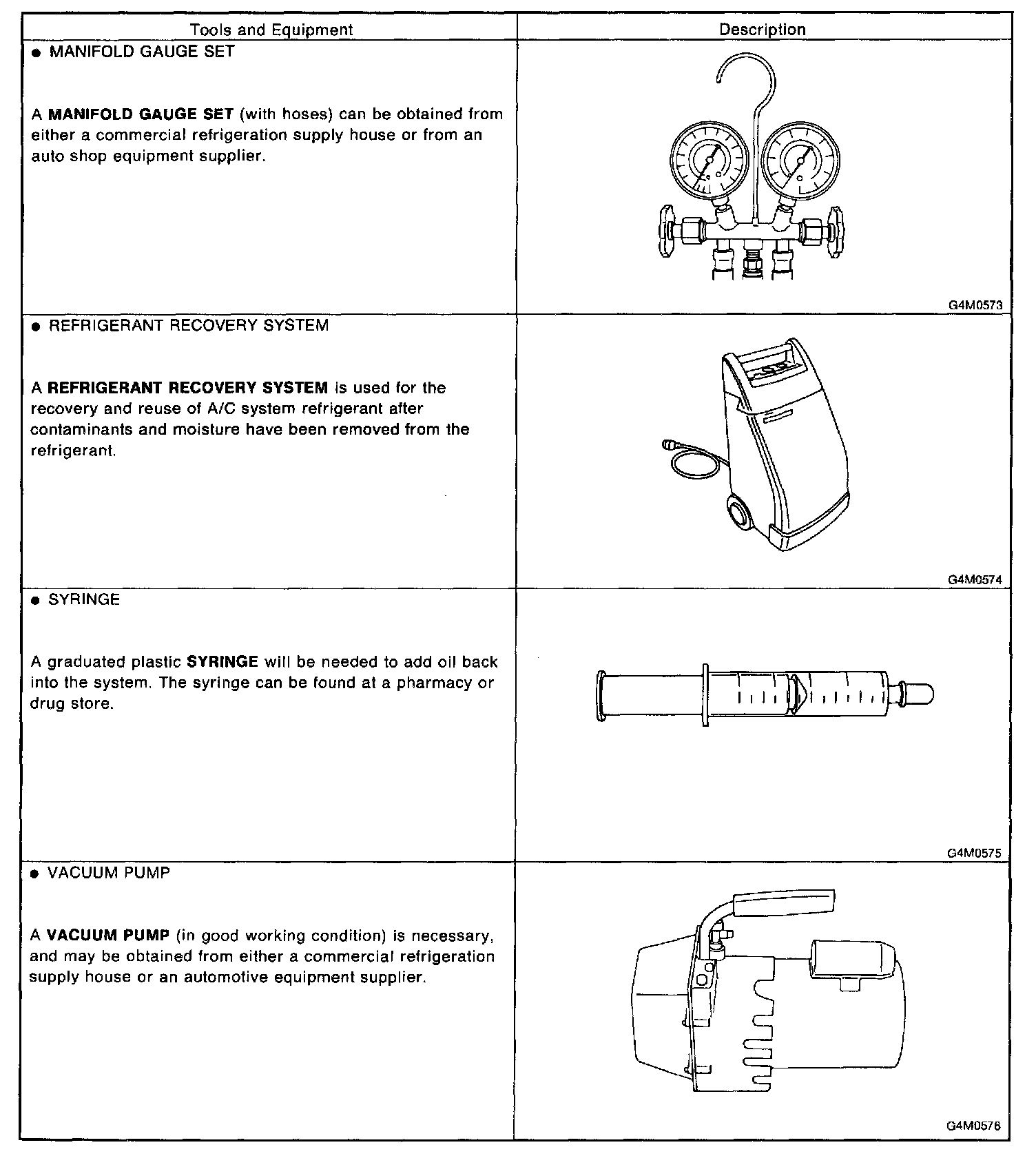 This section provides information about the tools and equipment that will be necessary to properly service the A/C system.