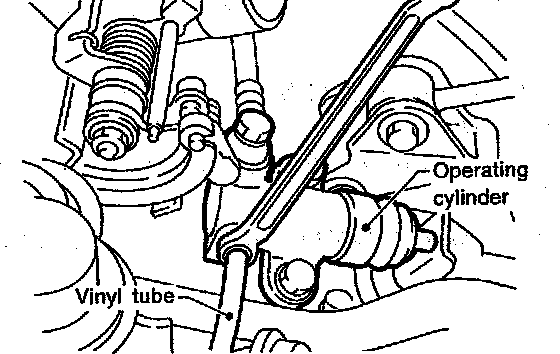 2. Fit one end of a vinyl tube into the air bleeder of operating cylinder and put the other end into a brake fluid container.