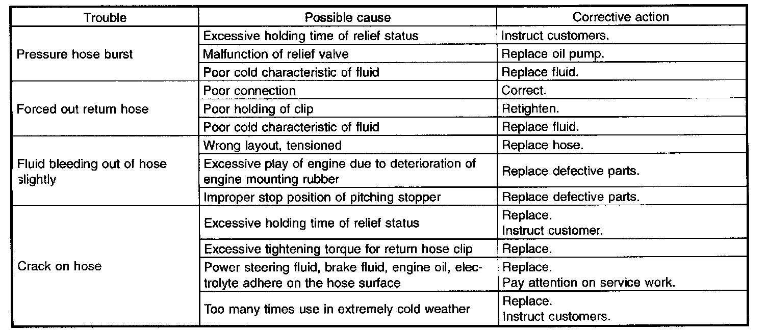 Since resistances for heat or low temperature brittleness decline over time, accumulation of hot or cold conditions for the hoses shorten their service lives accordingly. It is necessary to perform careful inspections frequently when the vehicle is used in hot weather areas, cold weather areas, and/or a driving condition in which many steering operations are required in a short time.