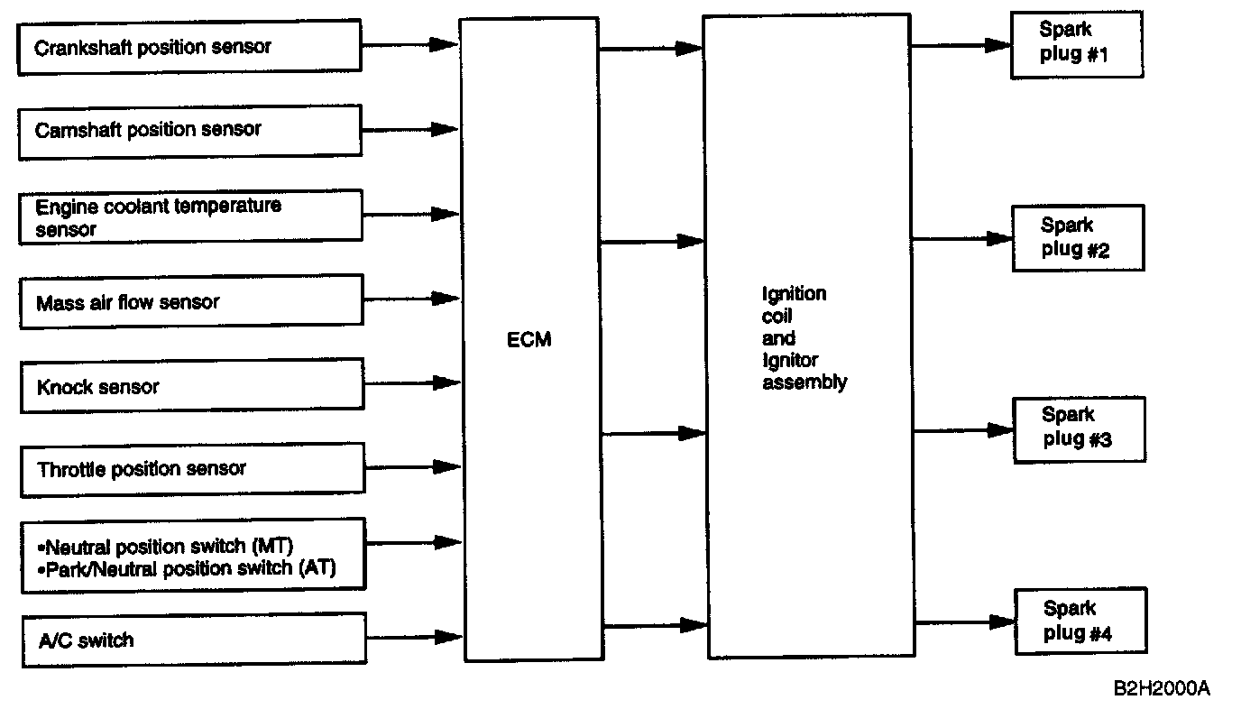 - The ECM receives signals emitted from the mass air flow sensor, engine coolant temperature sensor, crankshaft position sensor, camshaft position sensor, etc., to judge the operating condition of the engine. It then selects the optimum ignition timing stored in the memory and immediately transmits a primary current OFF signal to the ignitor to control the ignition timing.
