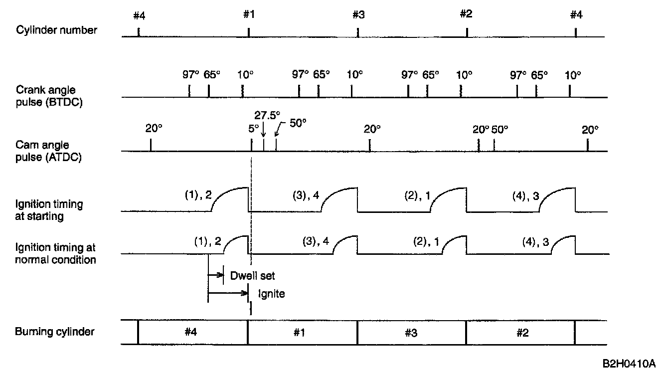 Engine speed fluctuate at the starting condition, so the ECM cannot control the ignition timing. When such a condition exists, ignition timing is fixed at 10° BTDC by using the 10° signal.