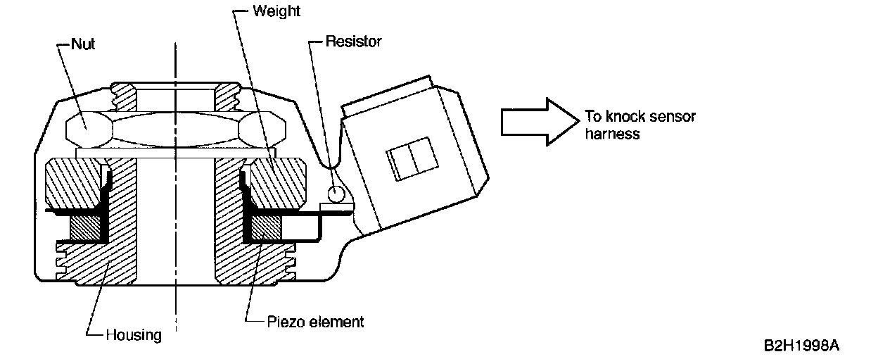 - It consists of a piezo-electric element, weight, and case. If knocking occurs in the engine, the weight in the case moves causing the piezo-electric element to generate a voltage.