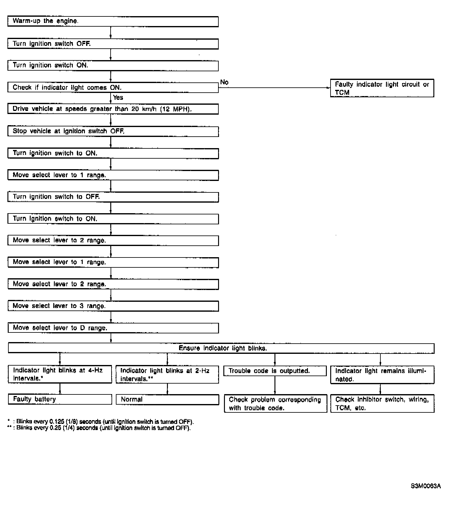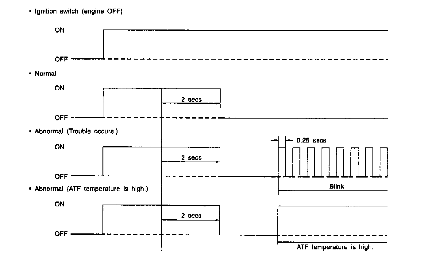 When any on-board diagnostics item is malfunctioning, the display on the AT OIL TEMP indicator lamp blinks from the time the malfunction is detected after starting the engine until the ignition switch is turned OFF. The malfunctioning part or unit can be determined by a trouble code during on-board diagnostics operation. Problems which occurred previously can also be identified through the memory function. If the AT OIL TEMP indicator does not show a problem (although a problem is occurring), the problem can be determined by checking the performance characteristics of each sensor using the select monitor. Indicator signal is as shown in the figure.