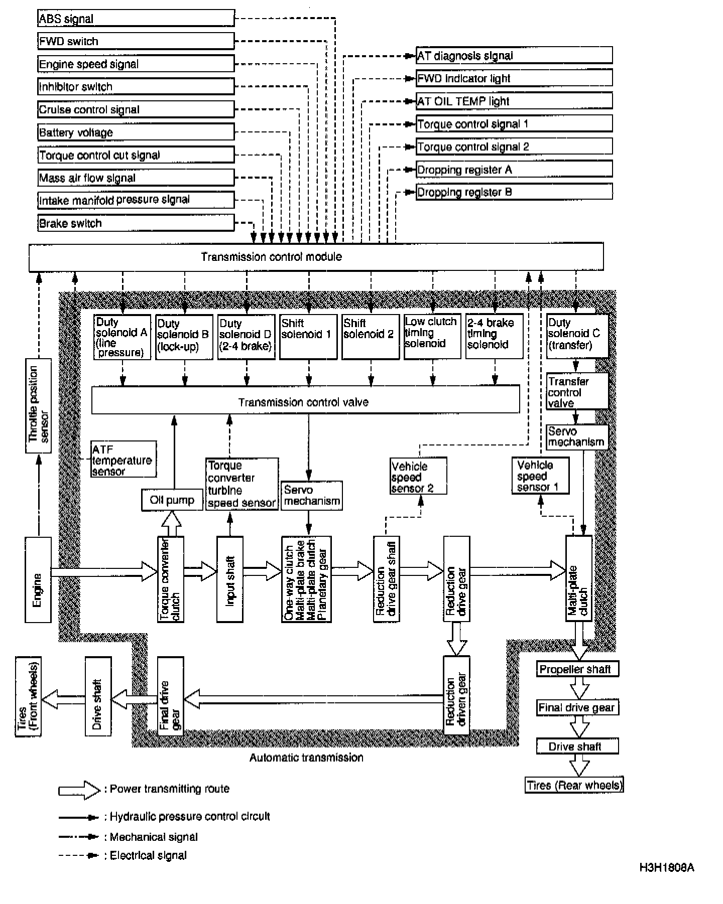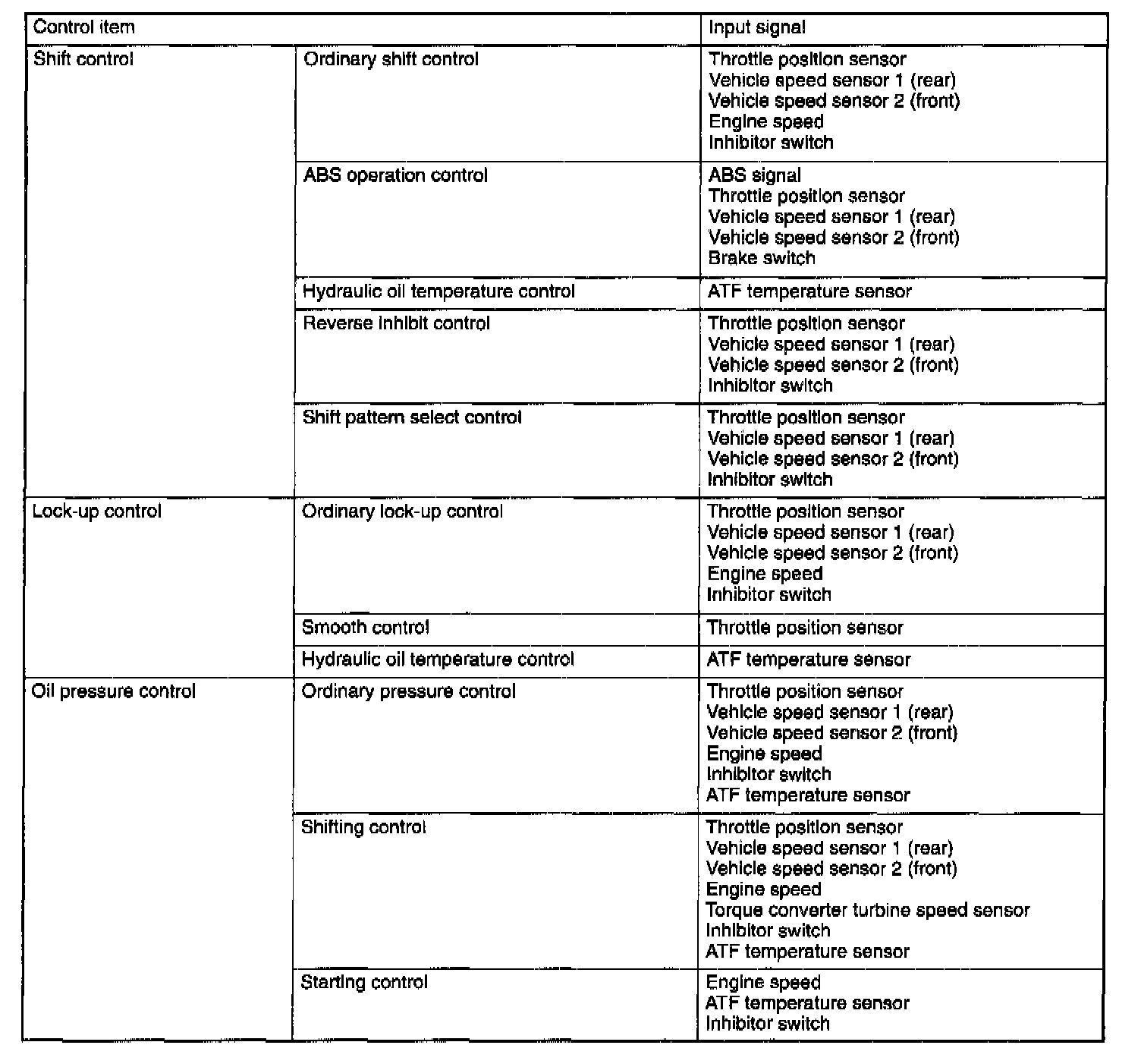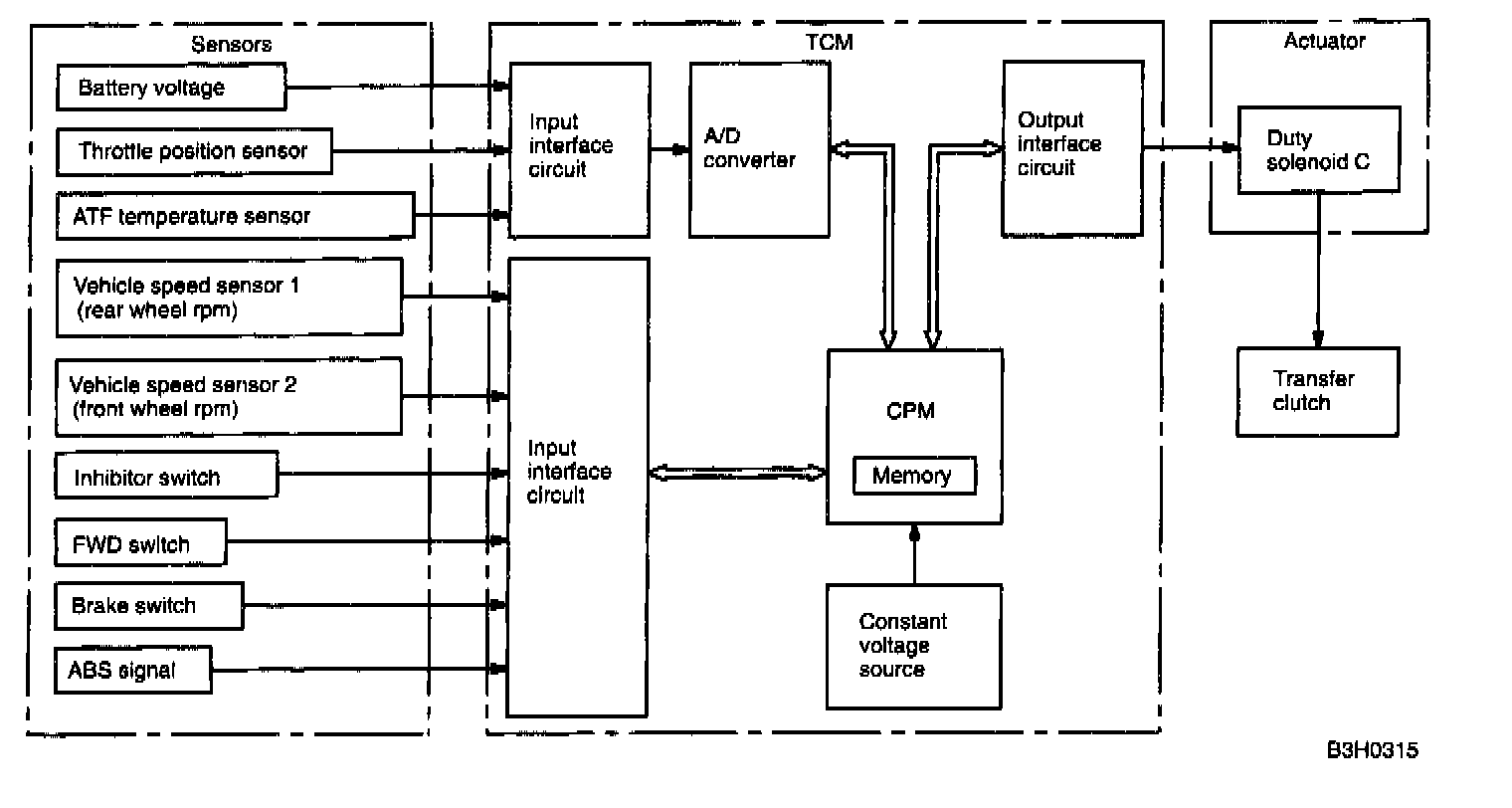 Transmission Control Module (TCM)TCM receives various sensor signals and determines the running conditions of the vehicle. It then sends control signals to each solenoid according to the preset gearshift characteristic data, lockup operation data, and transfer clutch torque data (duty ratio).