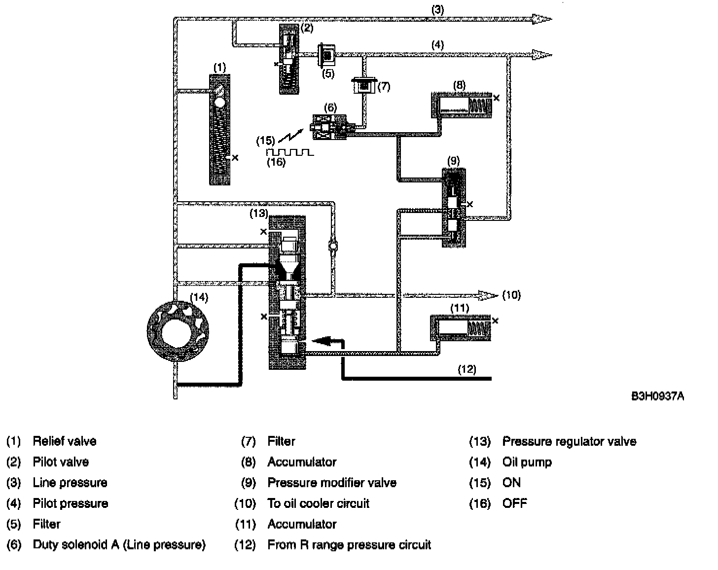 ^ The oil pump delivery pressure (line pressure) is regulated to the constant pilot pressure by the pilot valve.