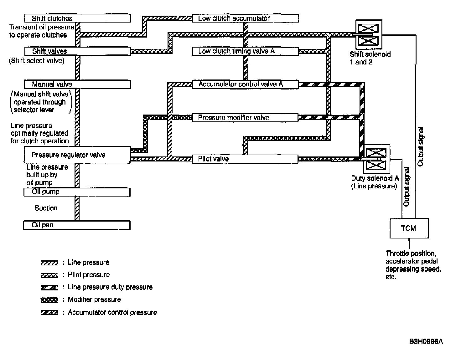 ^ The pilot pressure applied to the pressure modifier valve is regulated by the line pressure controlling duty solenoid A (line pressure) and changed into the pressure modifier pressure.