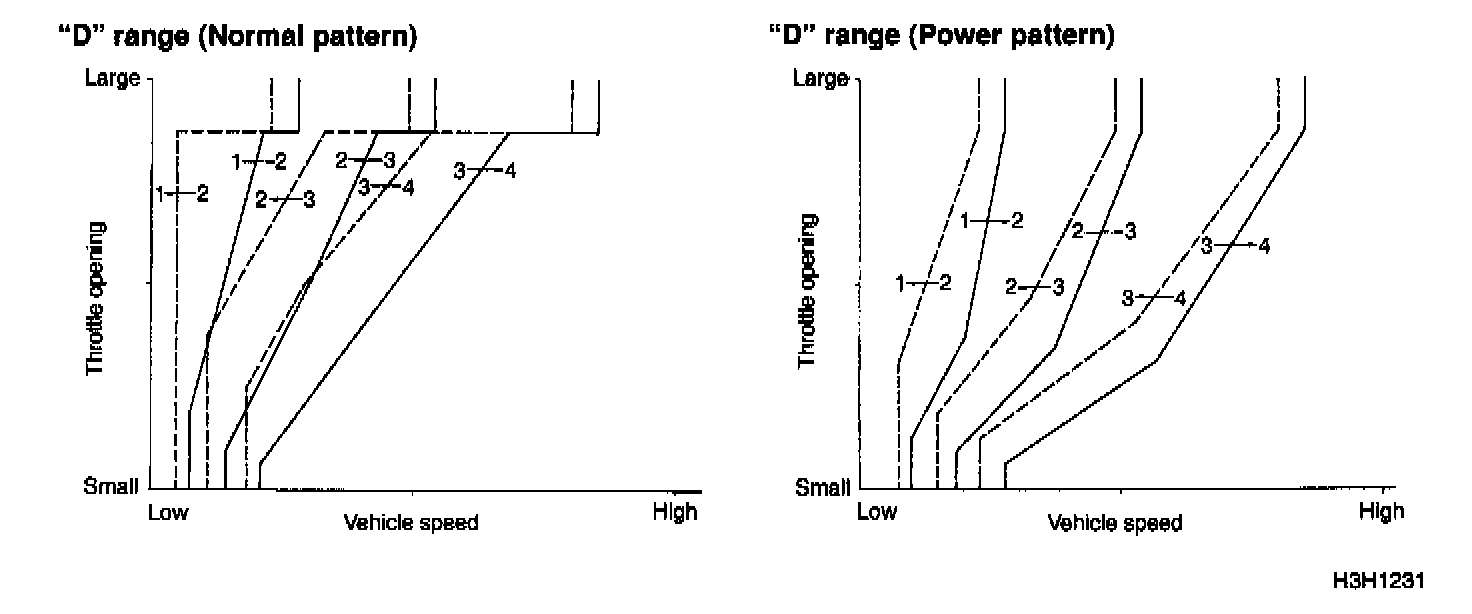 The power pattern is shifted to the normal pattern, depending on car speed. Shifting to the normal pattern is determined by the throttle position as shown in Figure. Time lag in shifting is also determined by car speed. The maximum time lag is 3 seconds.