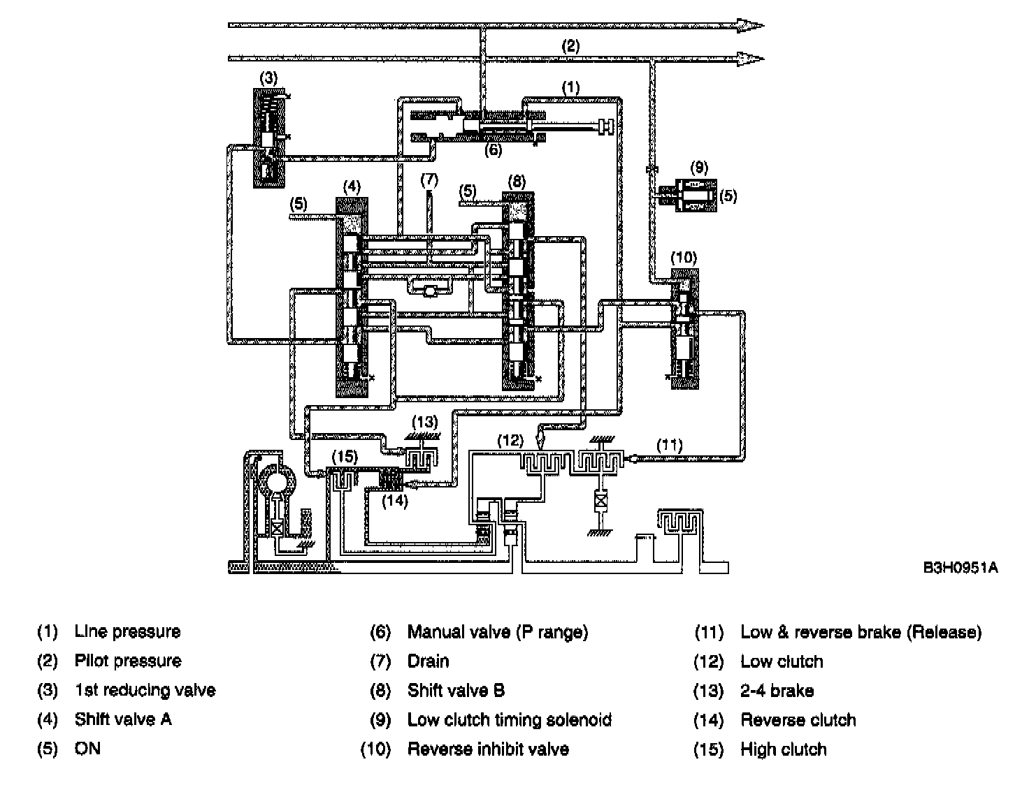 In this condition, the low & reverse brake does not engage since the ATF flowing from the manual valve is blocked by the reverse inhibit valve.