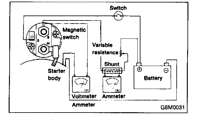 With switch on, adjust the variable resistance to obtain 11 V, take the ammeter reading and measure the starter speed. Compare these values with the specifications.