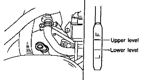 2. Make sure the vehicle is level. After selecting all positions (P, R, N, D, 3, 2, 1), set the selector lever in "P" range. Measure fluid level with the engine idling.
