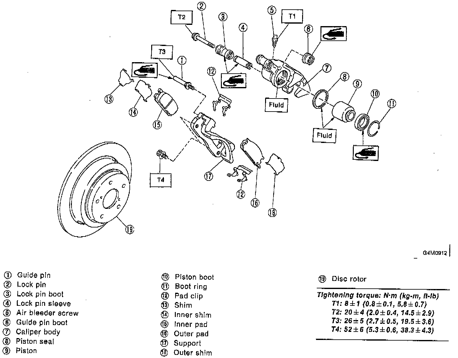 NOTE: If it is difficult to push piston during pad replacement, loosen air bleeder to facilitate work.