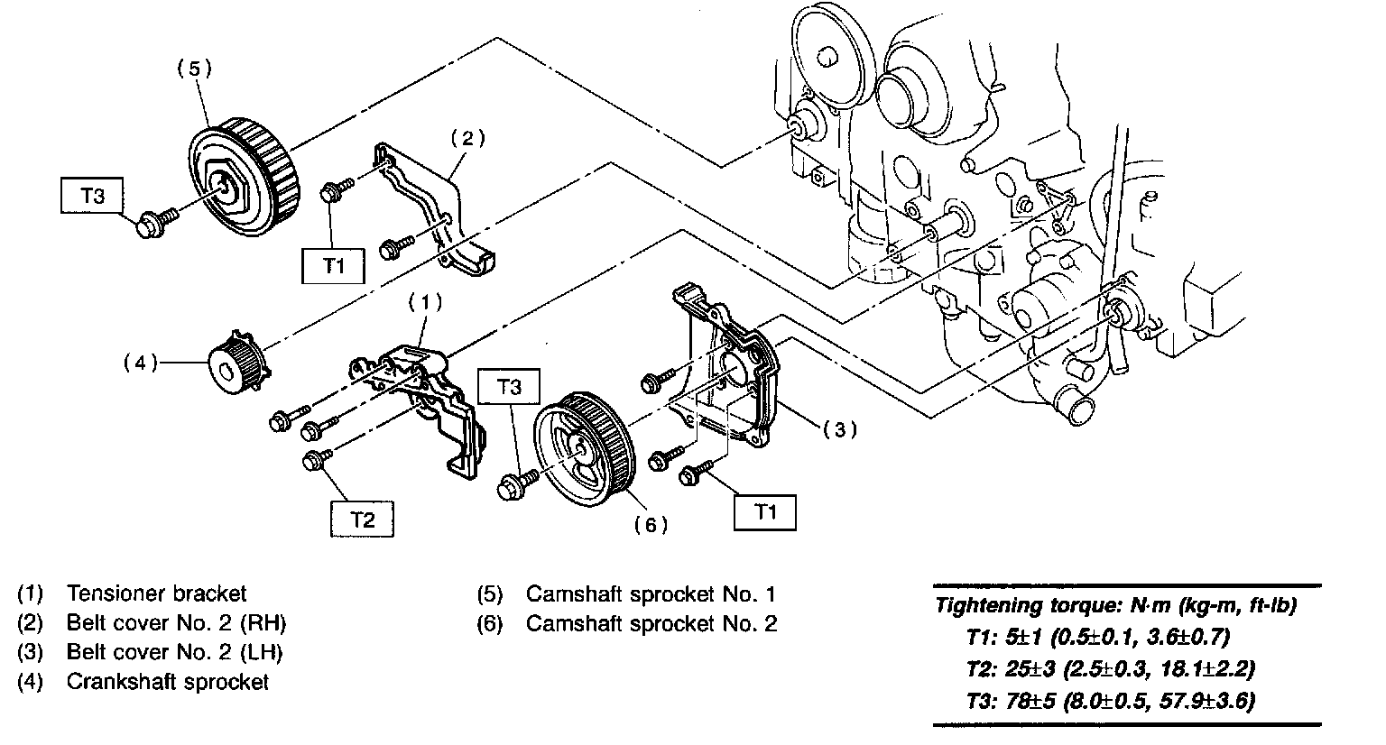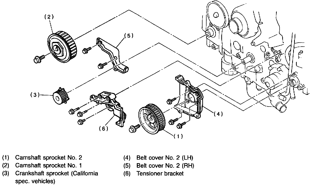 CAUTION: Do not confuse left and right side camshaft sprockets during installation. The camshaft sprocket No. 2 is identified by a projection used to monitor camshaft position sensor.