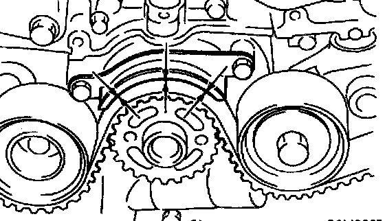 2. Using white paint, put alignment and/or arrow marks on timing belts in relation to the sprockets.
