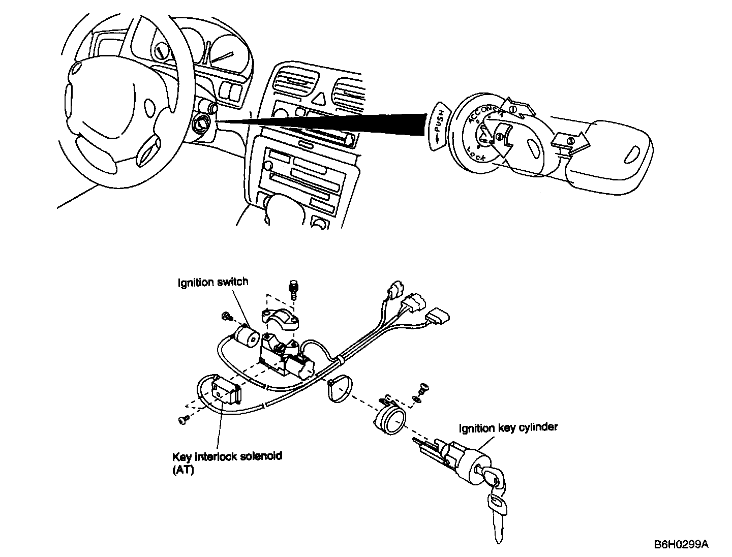 NOTE: If the key cannot be turned to "LOCK" position although select lever is in P position (because of key interlock system failure), the key interlock system must be canceled by key interlock release lever which is located at the lower side of the steering column.