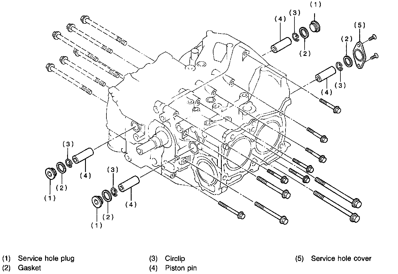 2. Rotate crankshaft to bring #1 and #2 pistons to bottom dead center position, then remove piston circlip through service hole of #1 and #2 cylinders.