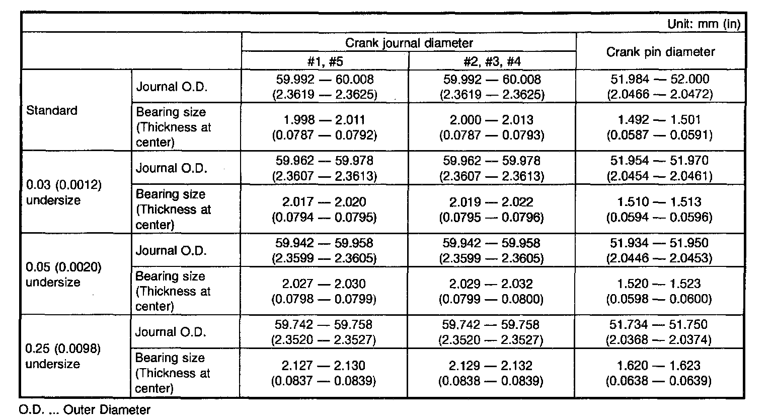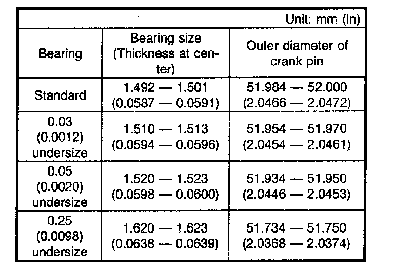 3. Inspect the crank journal and crank pin for wear. If not to specifications, replace bearing with an undersize one, and replace or recondition crankshaft as necessary. When grinding crank journal or crank pin, finish them to the specified dimensions according to the undersize bearing to be used.
