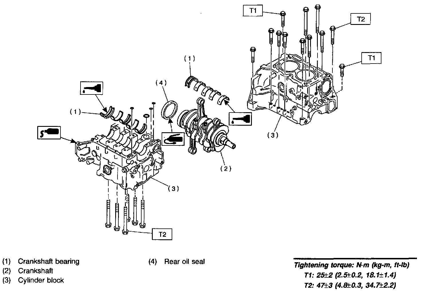 CAUTION: Remove oil in the mating surface of bearing and cylinder block before installation. Also apply a coat of engine oil to crankshaft pins.
