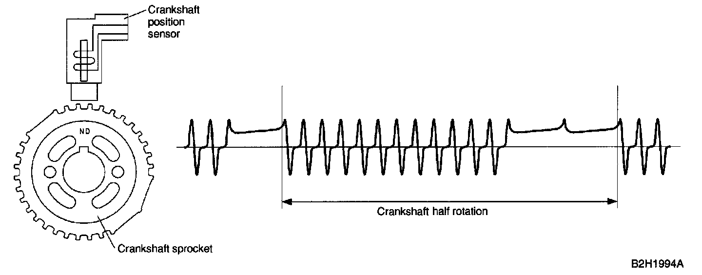 - Crankshaft rotation causes these protrusions to cross the crankshaft position sensor so that magnetic fluxes in the coil change with the change in air gap between the sensor pickup and the sprocket The change in air gap induces an electromotive force which is transmitted to the ECM.