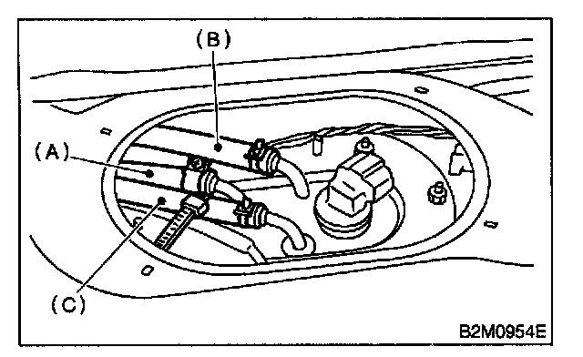 4. Disconnect fuel delivery hose (A), return hose (B) and jet pump hose (C).