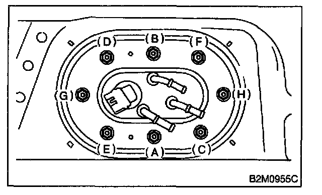 CAUTION: Leave fuel filler cap open when tightening nuts, to prevent fuel from flowing out through fuel delivery and return pipes. Close fuel filler cap after tightening nuts.