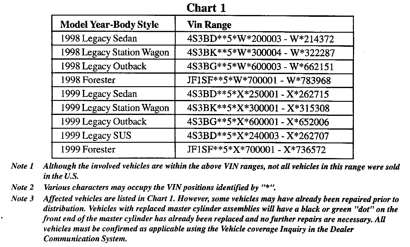 All 1998 and some 1999 Model Forester and Legacy Vehicles Equipped with ABS (See Chart 1)