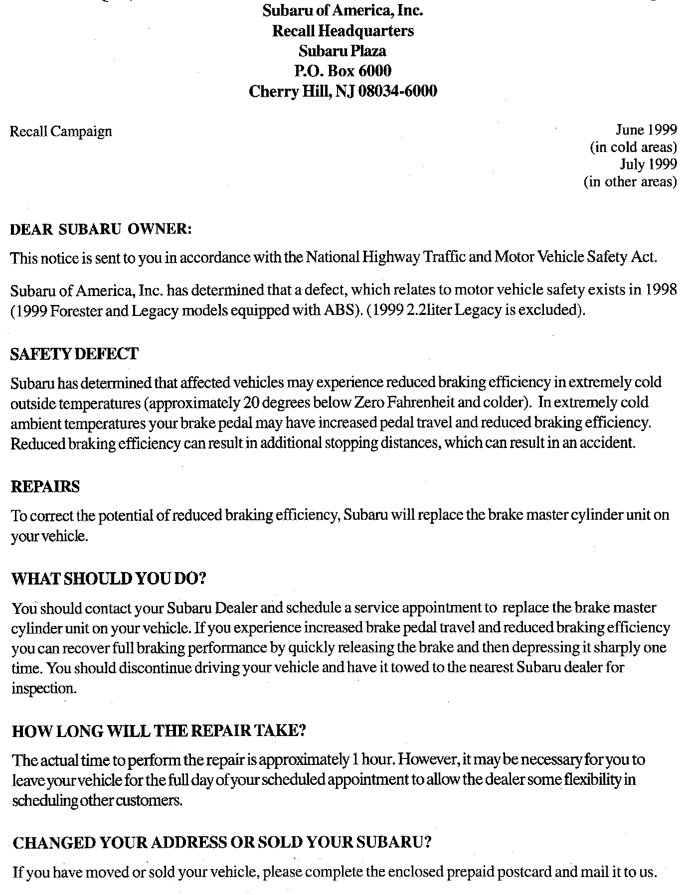 SOA will prepare and mail an Owner Notification Letter to owners of the potentially affected vehicles in 2 stages. Since this is a cold weather related problem, we will mail letters initially to potentially affected owners in cold weather areas. This includes owners in the 10 states of AK, MT, ND, MN, WI, MI, upstate NY, ME, NH, and VT. This initial mailing is planned for early June 1999. As additional parts are received, we will mail notification letters to owners of potentially affected vehicles in all other continental states.