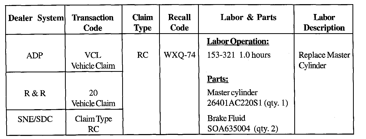 All properly submitted claims will receive a credit of 1.0 labor hours for replacement of the Master Cylinder. Parts will be reimbursed at dealer cost plus applicable handling allowance.