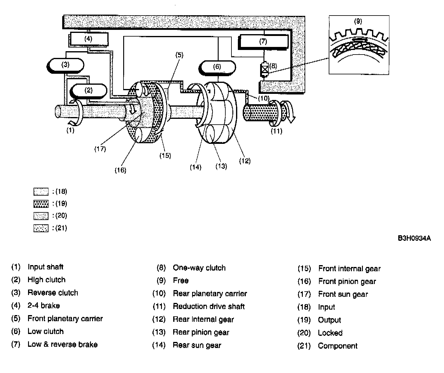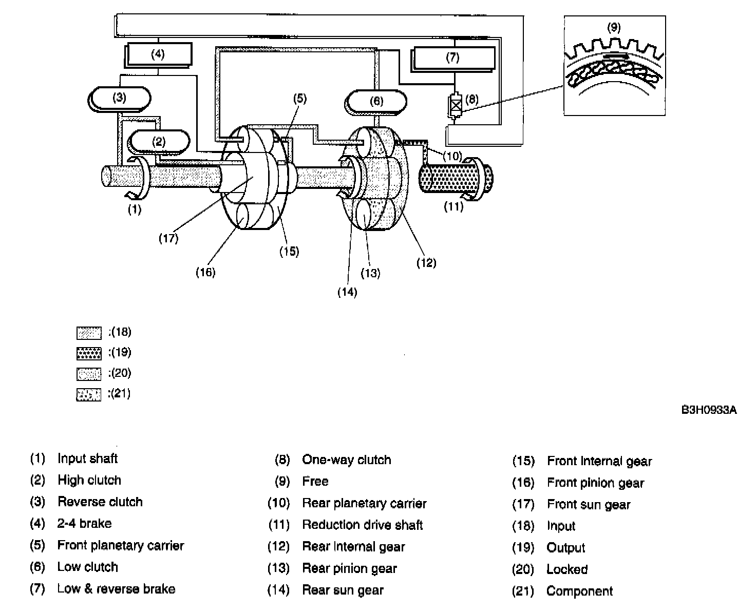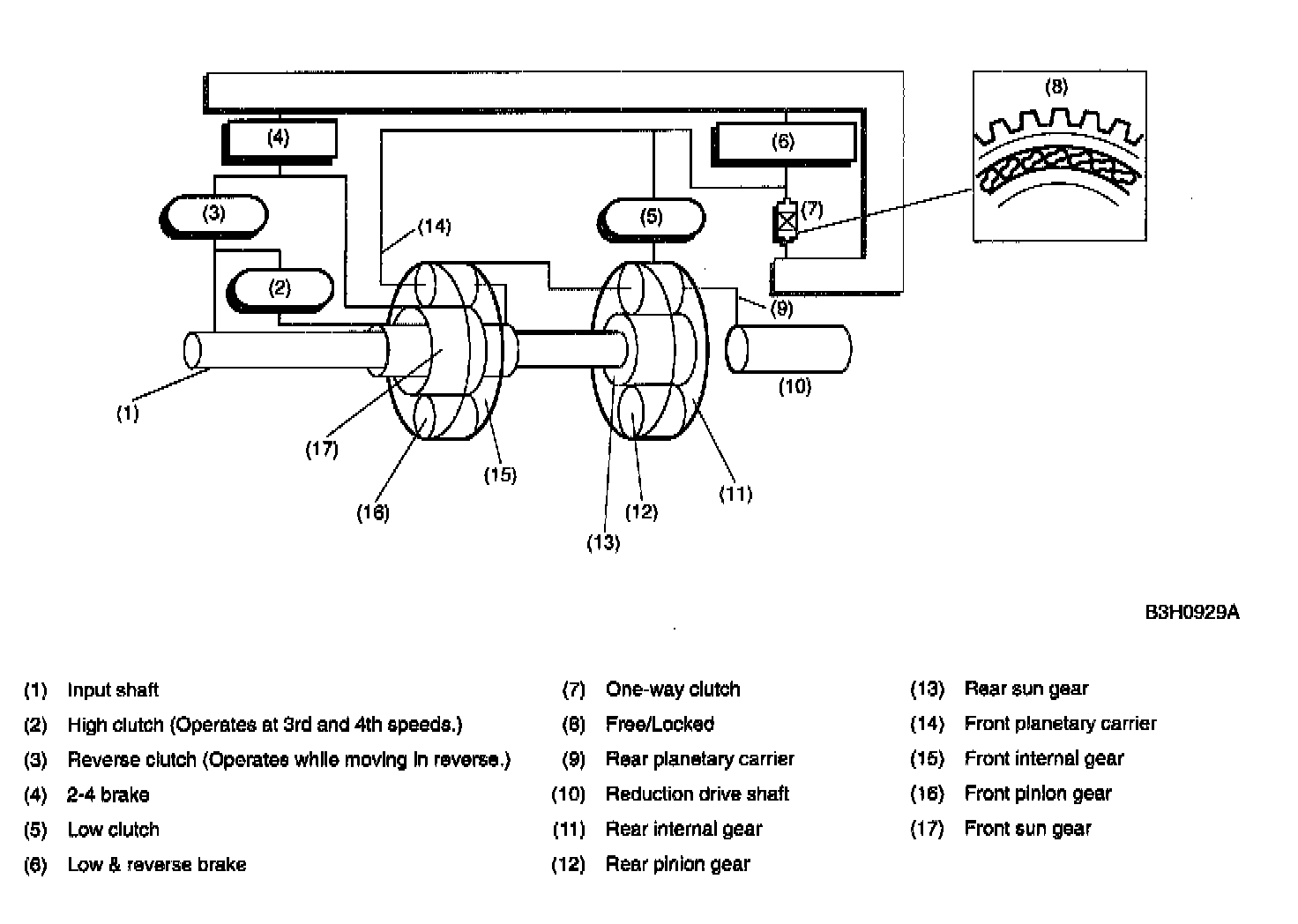 A: CONSTRUCTIONThe gear train consists of two sets of planetary gears, three sets of multi-plate clutches, two sets of multi-plate brakes and one set of one-way clutch.